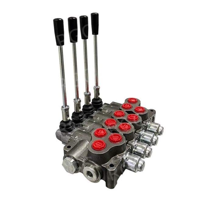 Моноблочный гидрораспределитель серии MBA-5. Монолитный корпус с предохранительным и обратным клапанами, 4 рабочими секциями. Управление: ручное. Возможные варианты управления: ручное, электропневматическое, тросовое
