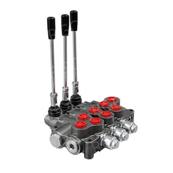 Моноблочный гидрораспределитель серии MBA-5. Монолитный корпус с предохранительным и обратным клапанами, 3 рабочими секциями. Управление: ручное. Возможные варианты управления: ручное, электропневматическое, тросовое