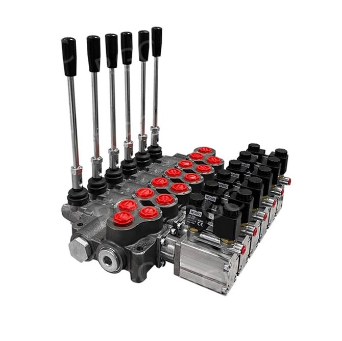 Моноблочный гидрораспределитель серии MBA-5. Монолитный корпус с предохранительным и обратным клапанами, 6 рабочими секциями. Управление: электропневматическое. Возможные варианты управления: ручное, электропневматическое, тросовое