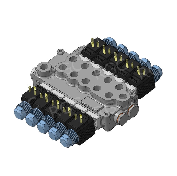 Моноблочные гидрораспределители серии MB-3. Монолитный корпус с предохранительным и обратным клапанами, от 1 до 6 рабочих секций. Управление: ручное, тросовое, электрическое и прочее. Расход — 45 л/мин, рабочее давление — 315 бар.